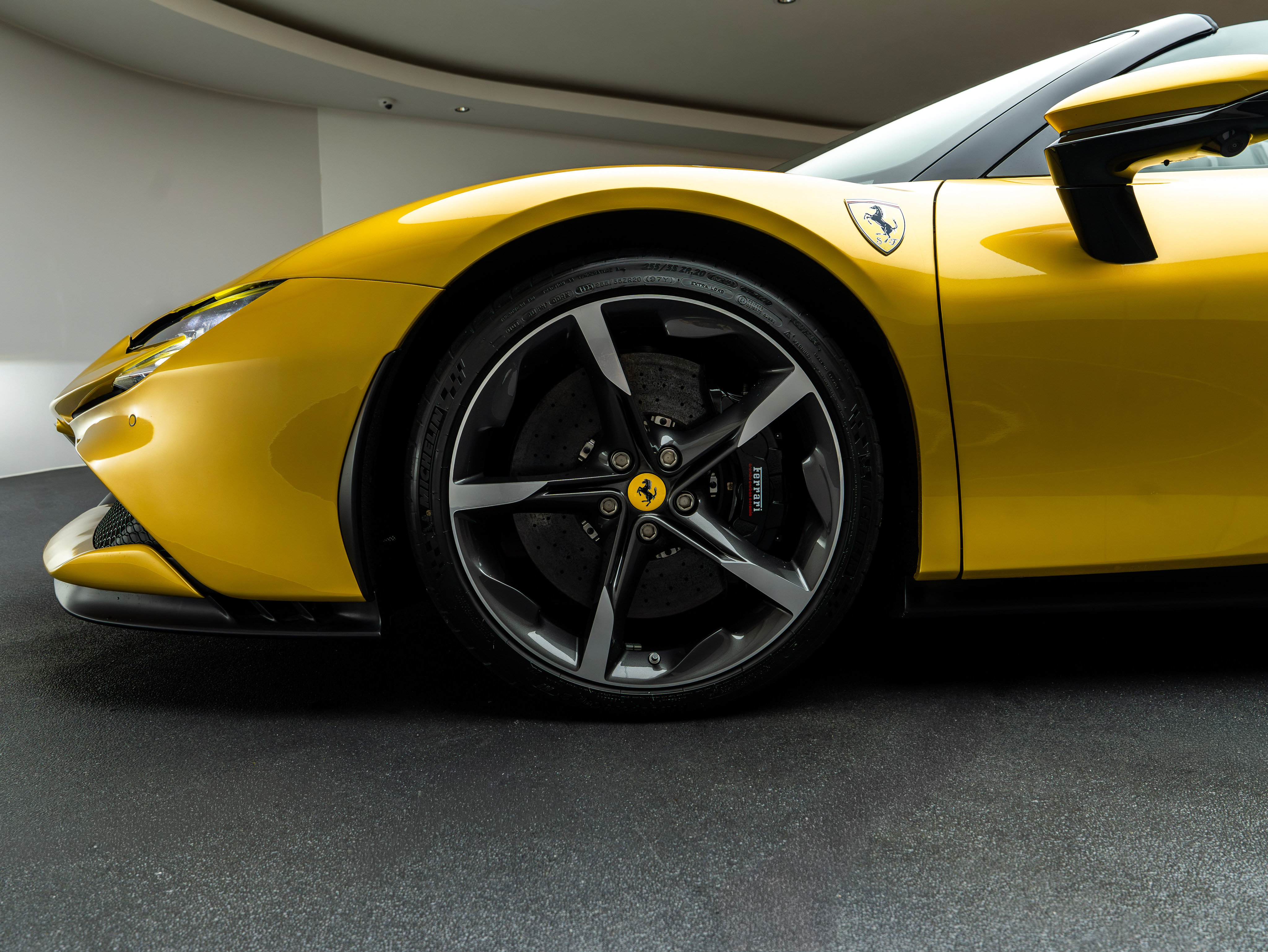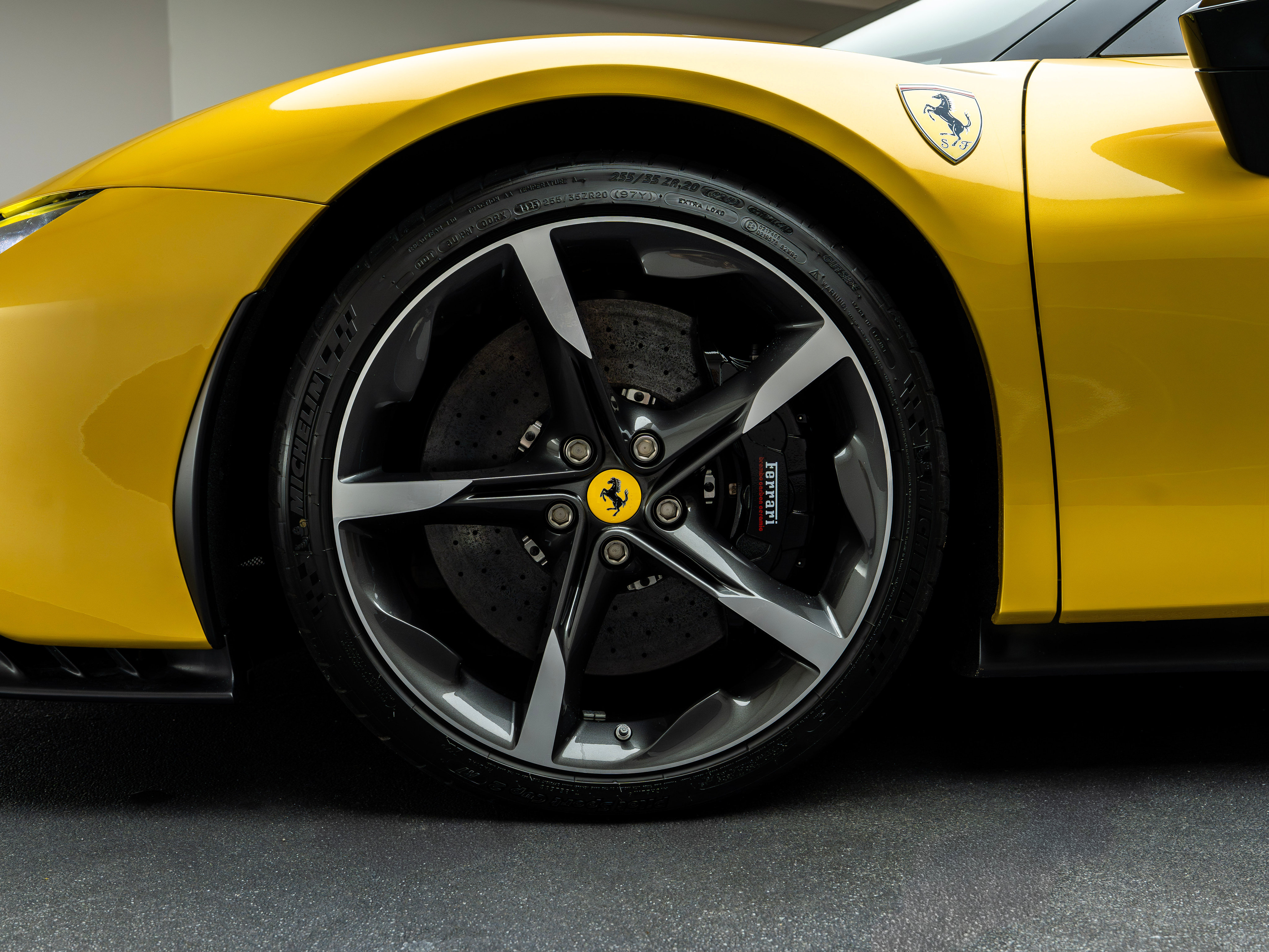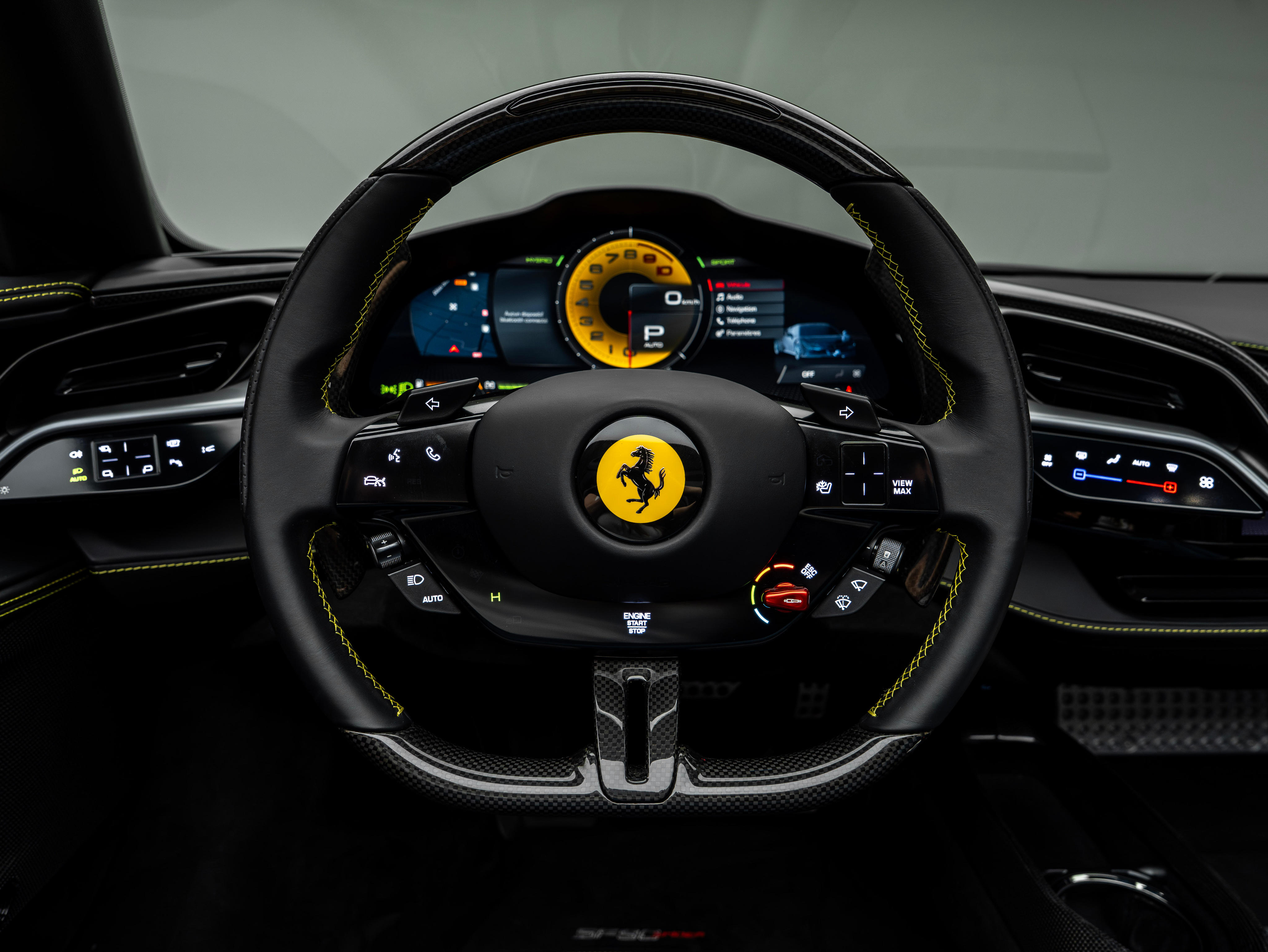 La Ferrari SF90 Spider est le premier spider Ferrari de série à système hybride plug-in allie haute technologie, performances de premier plan et plaisir de conduite en plein air. Le moteur V8 de 780 ch (auxquels s’ajoutent les 220 ch des trois moteurs électriques, pour un chiffre total impressionnant de 1 000 ch) est toujours visible à travers la lunette, même lorsque le toit rigide amovible s’ouvre, une opération qui ne nécessite que 14 secondes et peut même être effectuée quand la voiture est en mouvement.