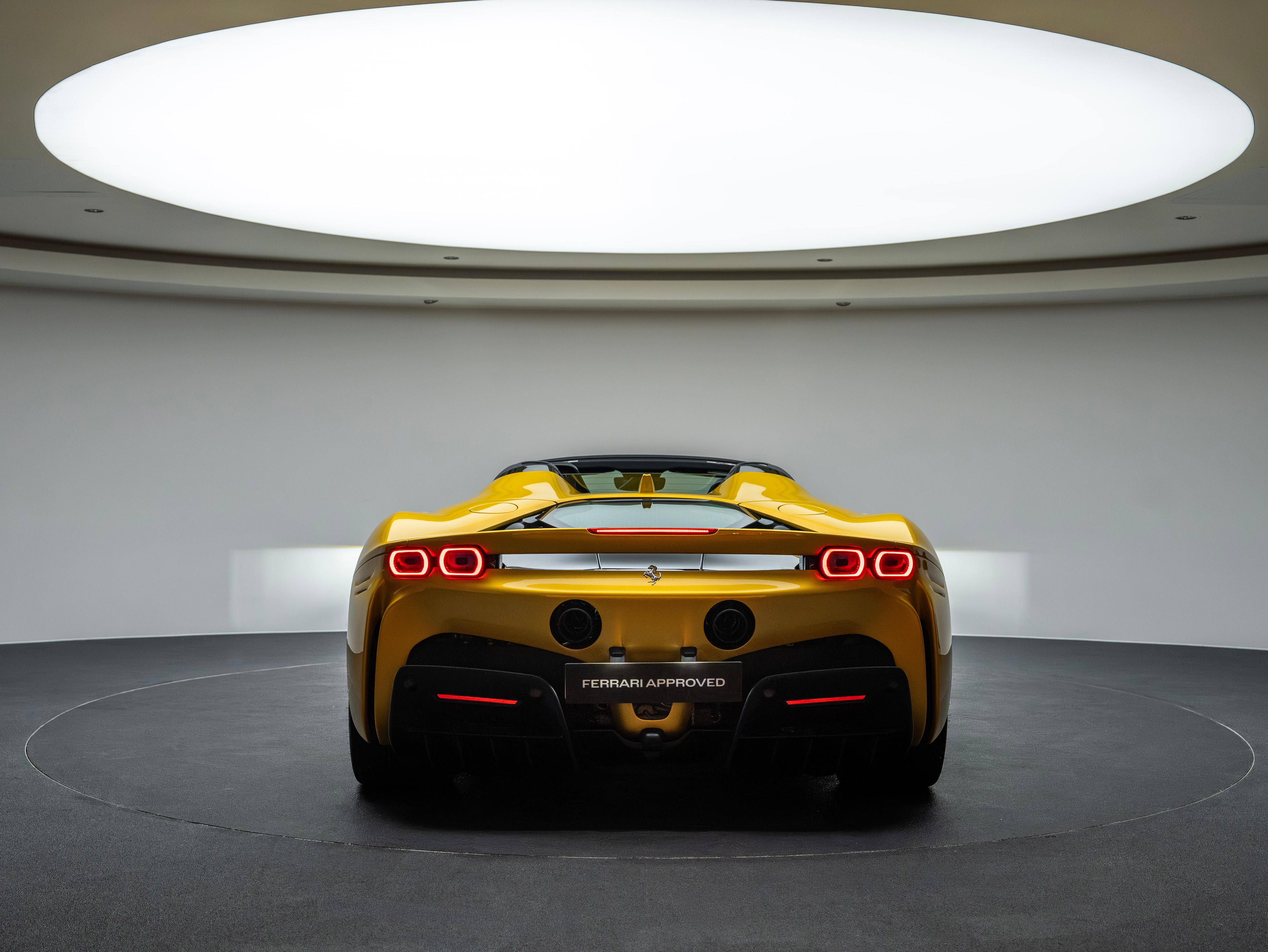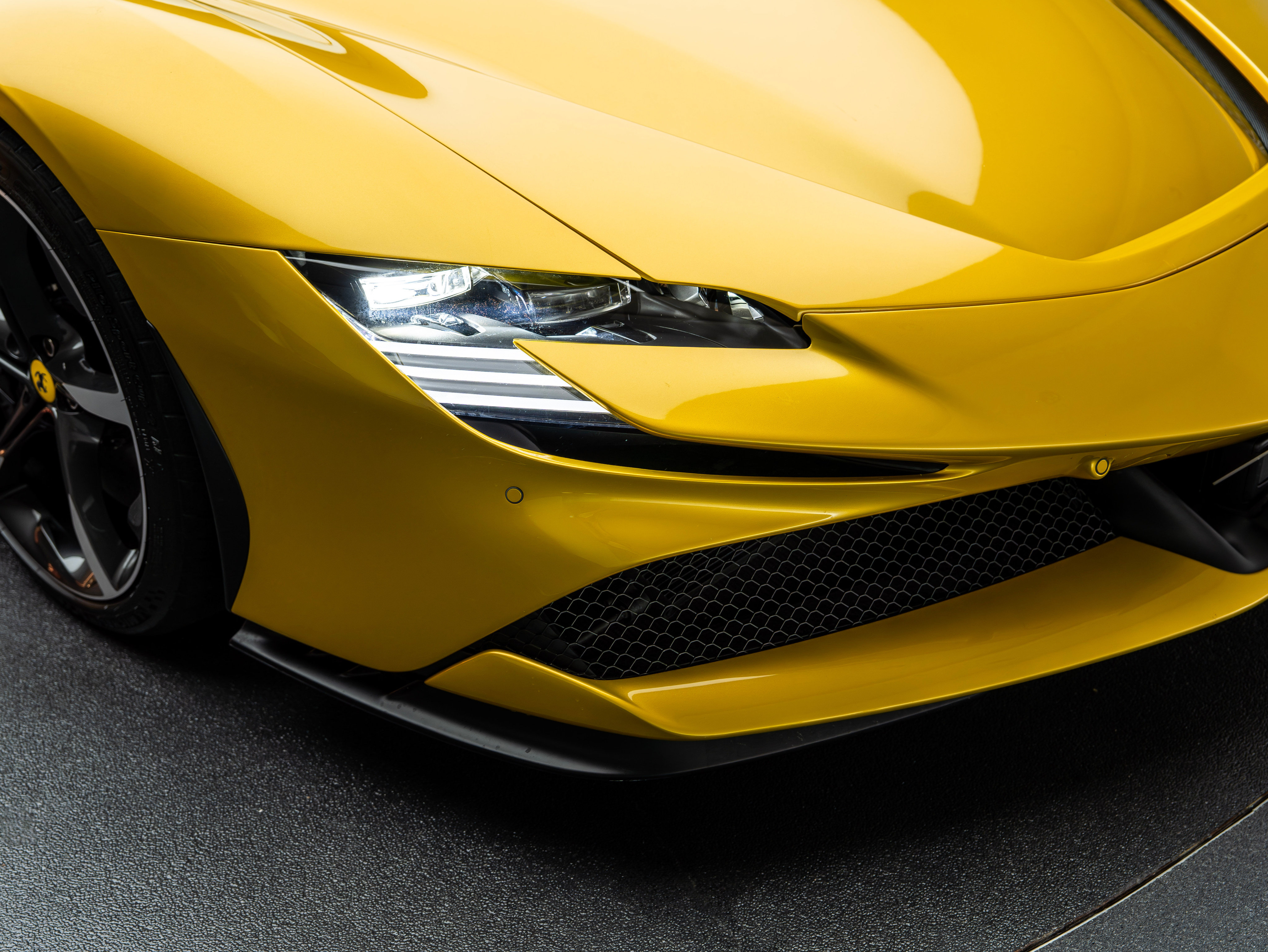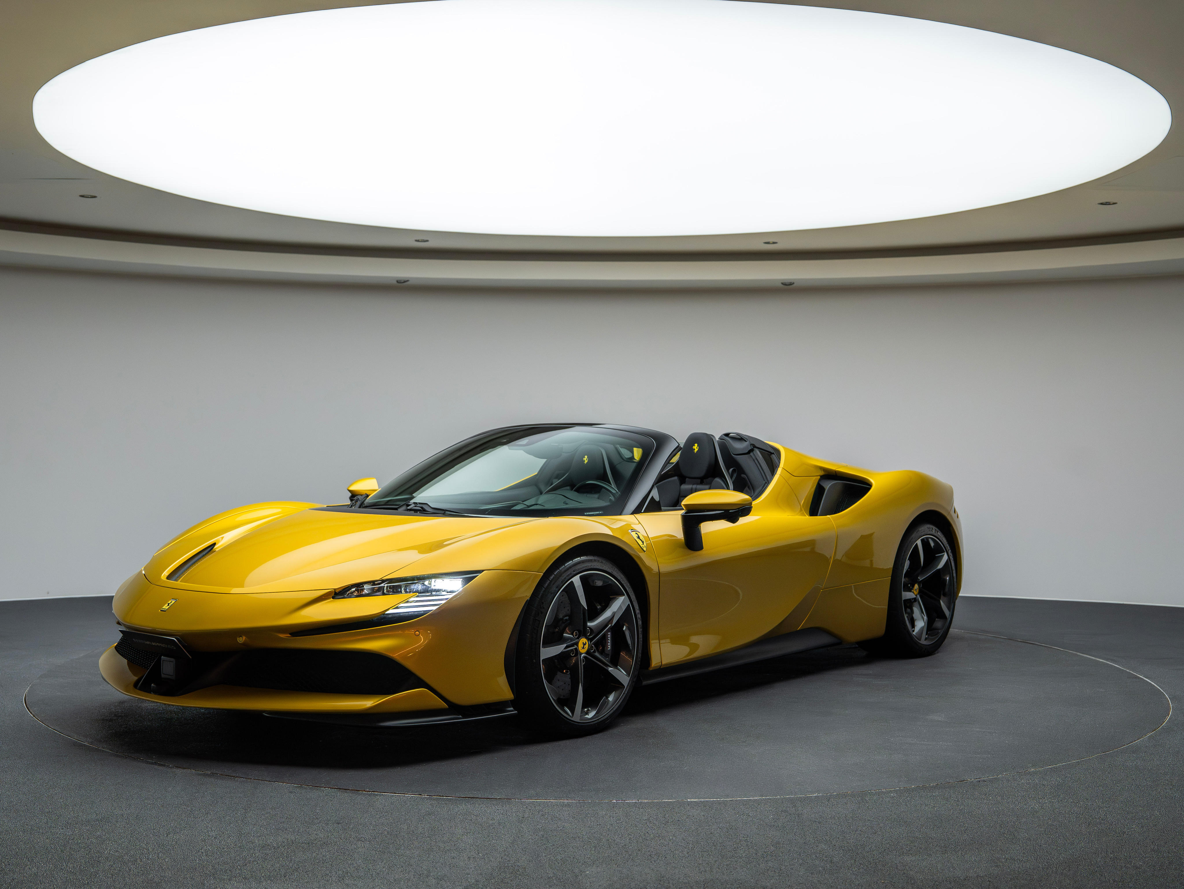 La Ferrari SF90 Spider est le premier spider Ferrari de série à système hybride plug-in allie haute technologie, performances de premier plan et plaisir de conduite en plein air. Le moteur V8 de 780 ch (auxquels s’ajoutent les 220 ch des trois moteurs électriques, pour un chiffre total impressionnant de 1 000 ch) est toujours visible à travers la lunette, même lorsque le toit rigide amovible s’ouvre, une opération qui ne nécessite que 14 secondes et peut même être effectuée quand la voiture est en mouvement.