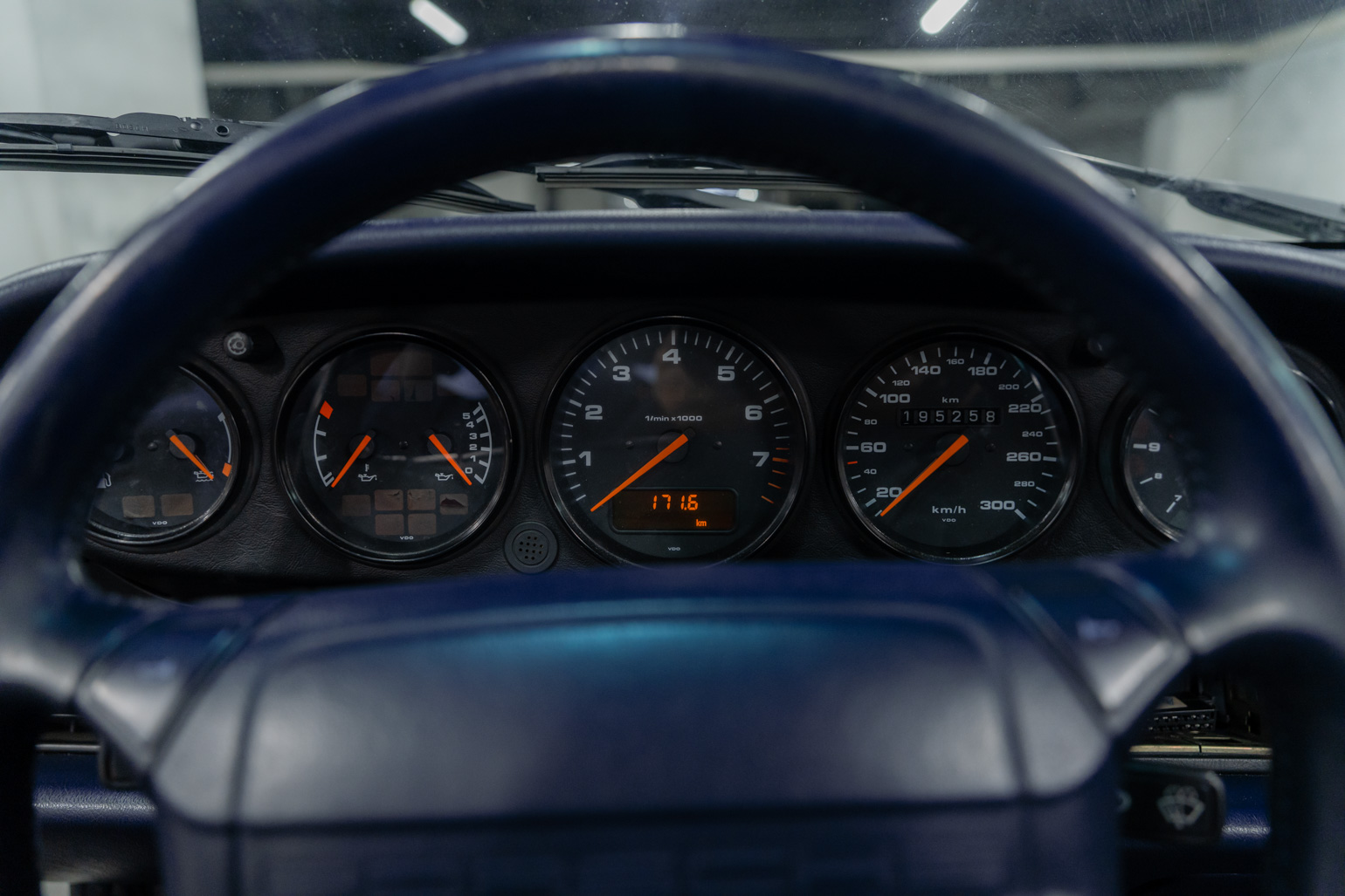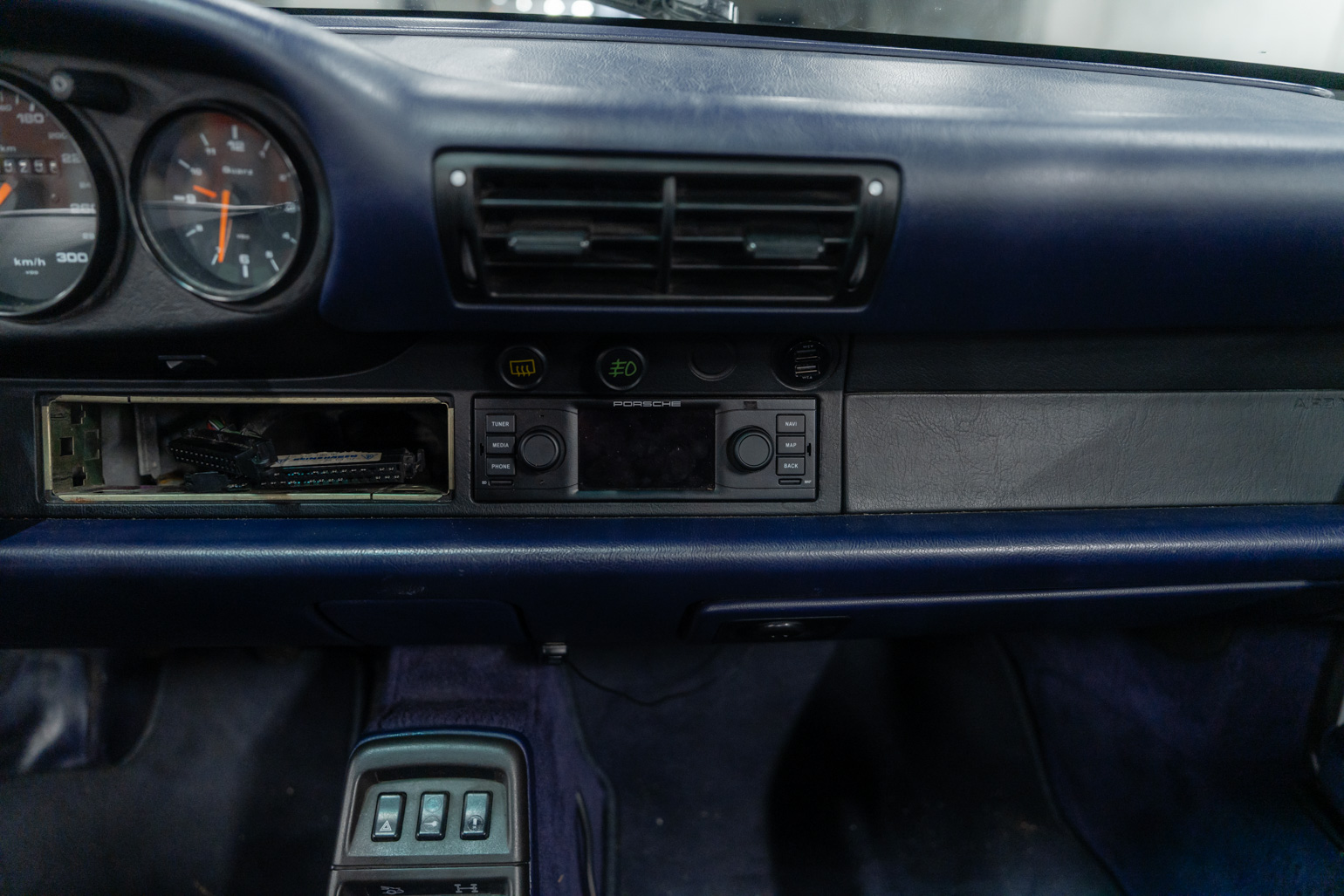 Presented in the Grand Prix White color (code 908) combined with a Maritime Blue interior (code L38B), this 964 has a configuration that is both elegant and unique. The body is in good overall condition, except for the slightly cracked front bumper requiring repainting. The cabin, very well preserved, maintains all its authenticity and its beautiful original patina. The on-board instrumentation is fully functional.
