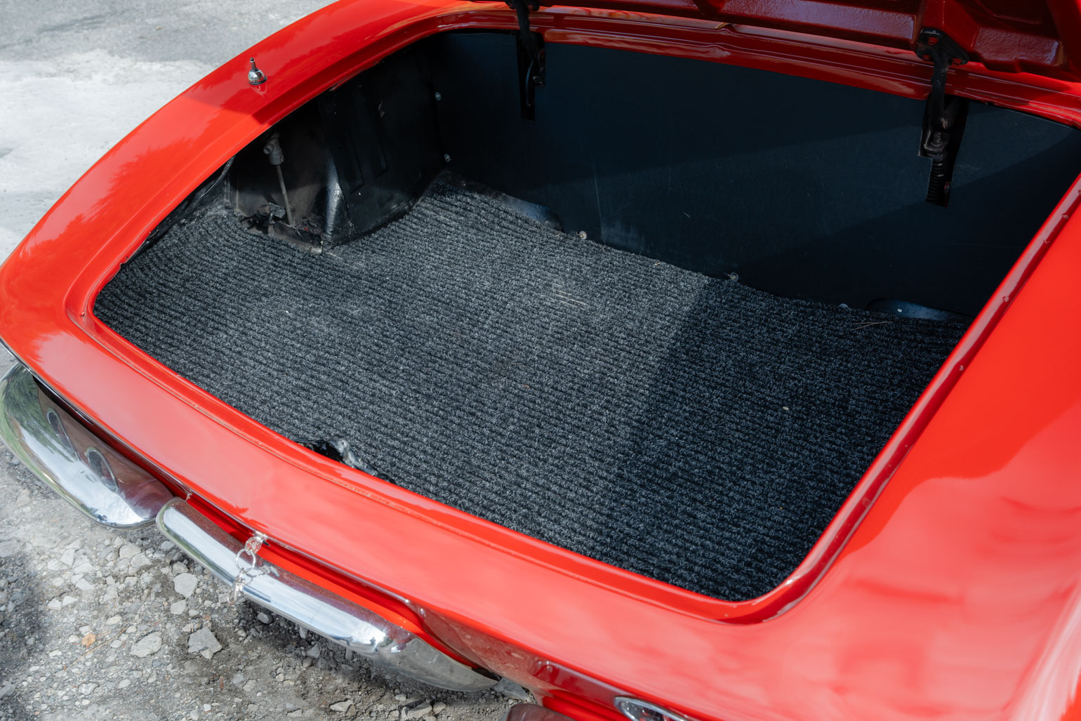 Présentée dans sa teinte extérieure Rouge, associée à un intérieur également Rouge, cette Corvette offre une présentation particulièrement homogène. La carrosserie est en très bon état général pour son âge, avec seulement quelques petits défauts sur les chromes. L’habitacle se trouve dans un excellent état, sans usure notable, et l’instrumentation de bord fonctionne normalement.