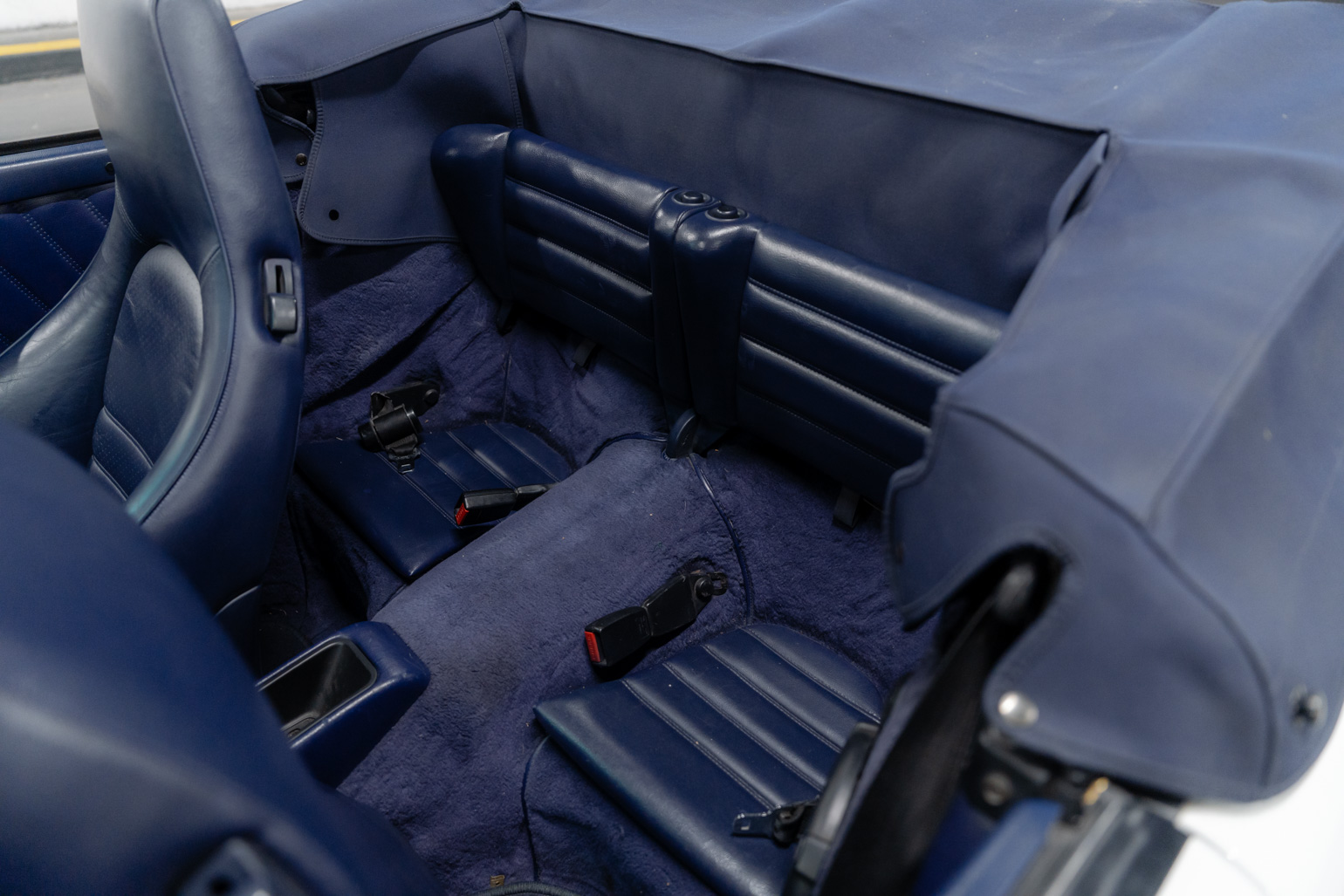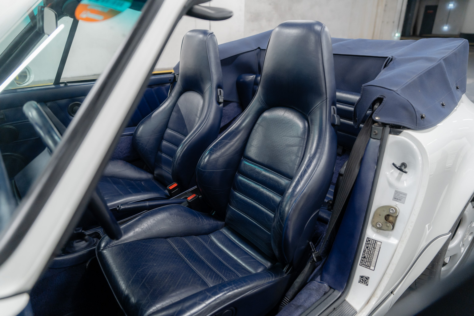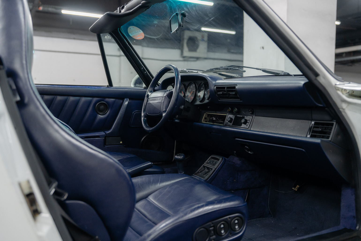 Présentée dans la teinte Blanc Grand Prix (code 908) associée à un intérieur en Maritime Blue (code L38B), cette 964 affiche une configuration à la fois élégante et singulière. La carrosserie est dans un bon état général, à l’exception du pare-chocs avant légèrement craquelé nécessitant une remise en peinture. L’habitacle, très bien conservé, conserve toute son authenticité et sa belle patine d’origine. L’instrumentation de bord est entièrement fonctionnelle.