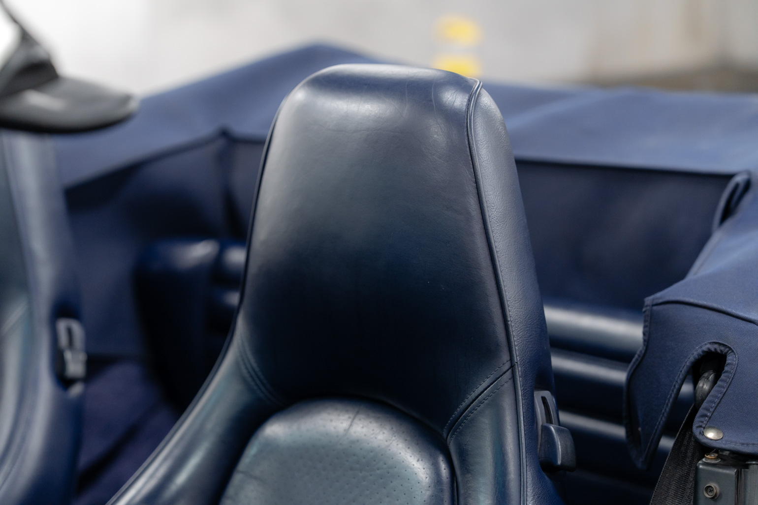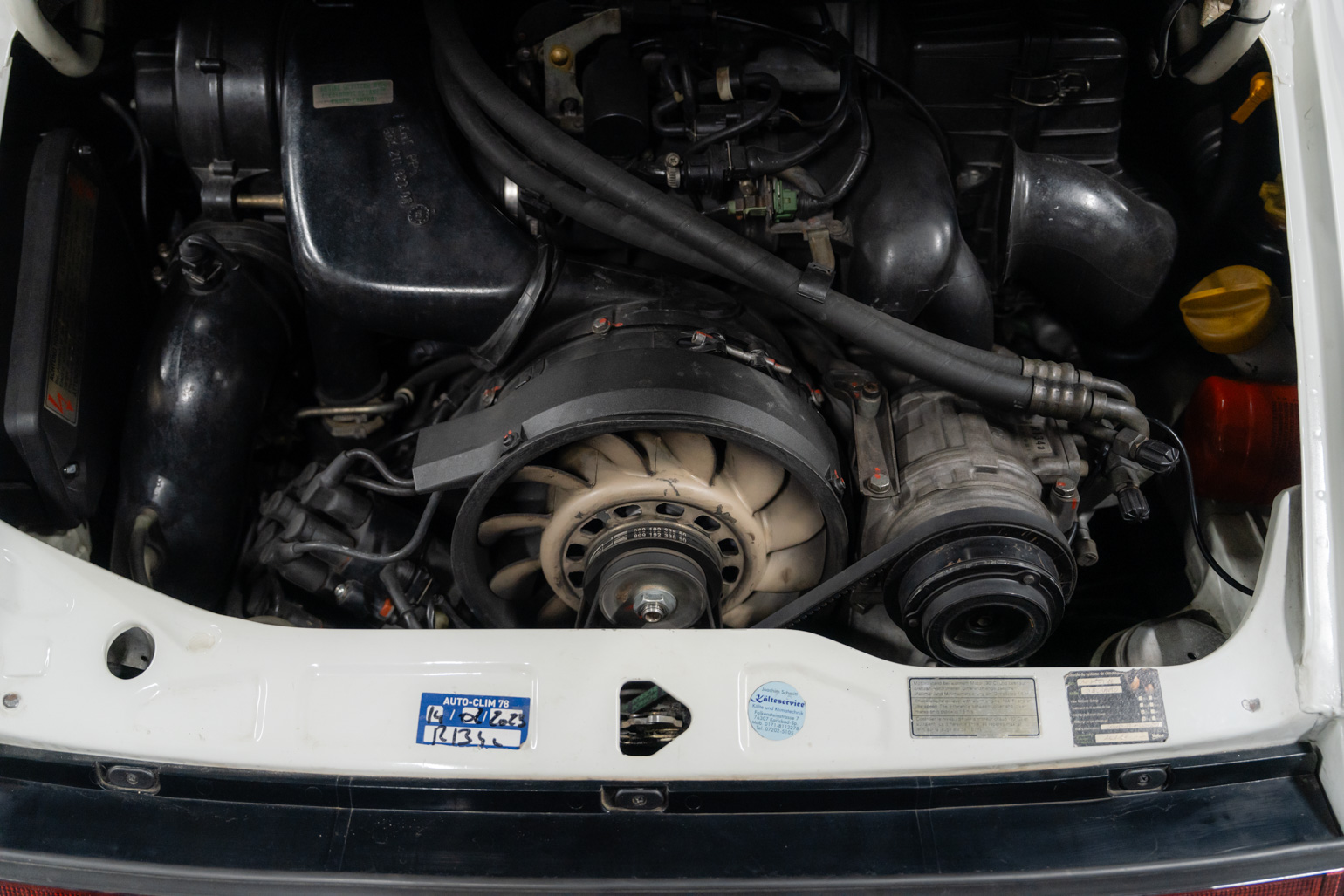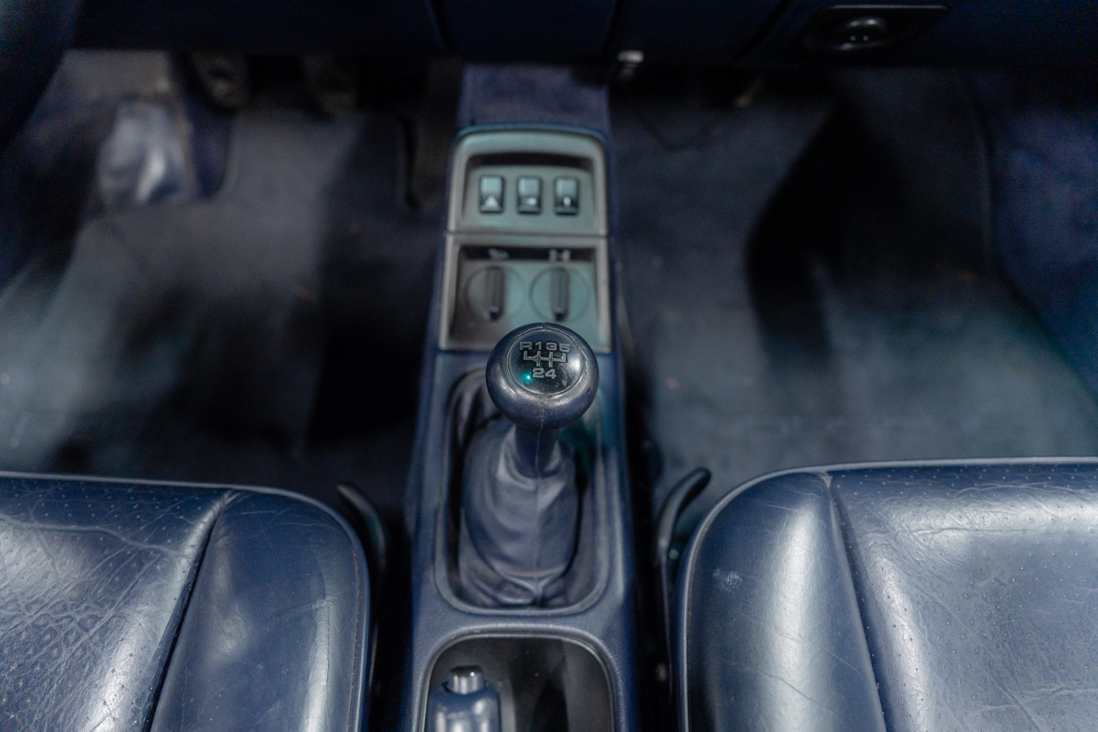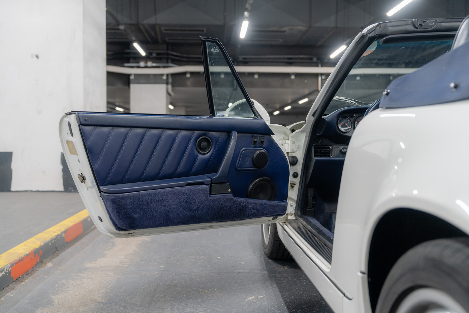 Présentée dans la teinte Blanc Grand Prix (code 908) associée à un intérieur en Maritime Blue (code L38B), cette 964 affiche une configuration à la fois élégante et singulière. La carrosserie est dans un bon état général, à l’exception du pare-chocs avant légèrement craquelé nécessitant une remise en peinture. L’habitacle, très bien conservé, conserve toute son authenticité et sa belle patine d’origine. L’instrumentation de bord est entièrement fonctionnelle.